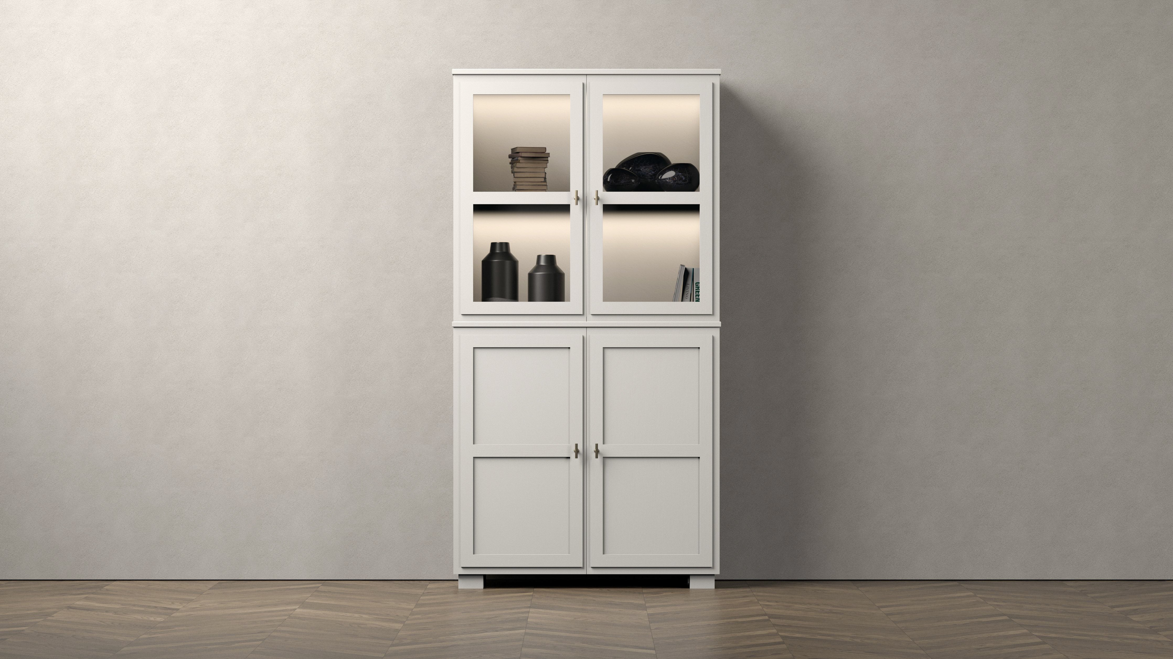 Camden Display cabinets offer an elegant and functional solution for storing and displaying your favorite items. The base consists of a sideboard with glass doors, a shelf and a practical drawer. Above is a section with glass doors and a shelf, which is completely hand-painted for a stylish and uniform expression. The built-in lighting highlights the content and creates a warm atmosphere. The furniture is available in the colors White and Black, perfect for giving your home a modern feel.