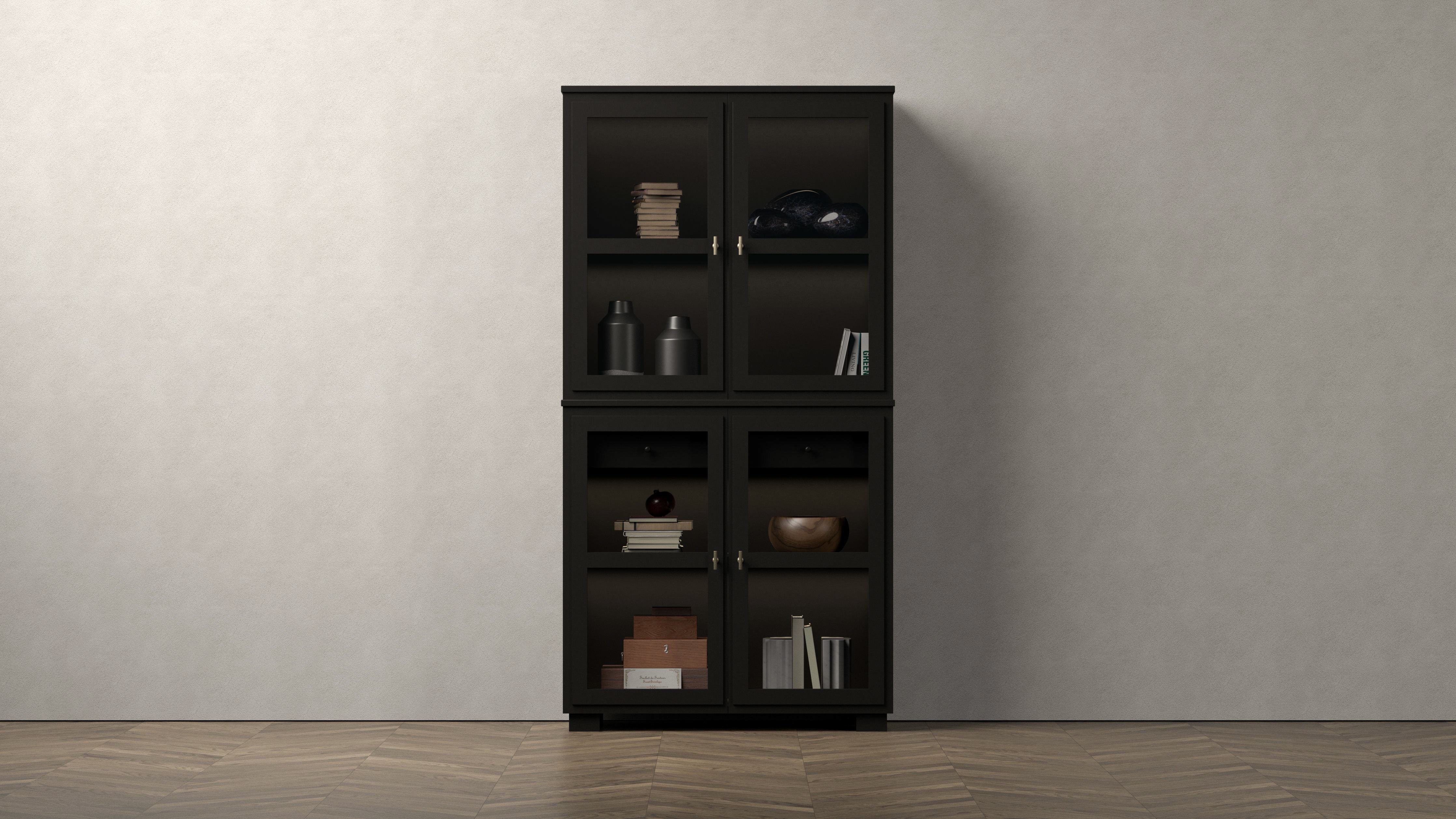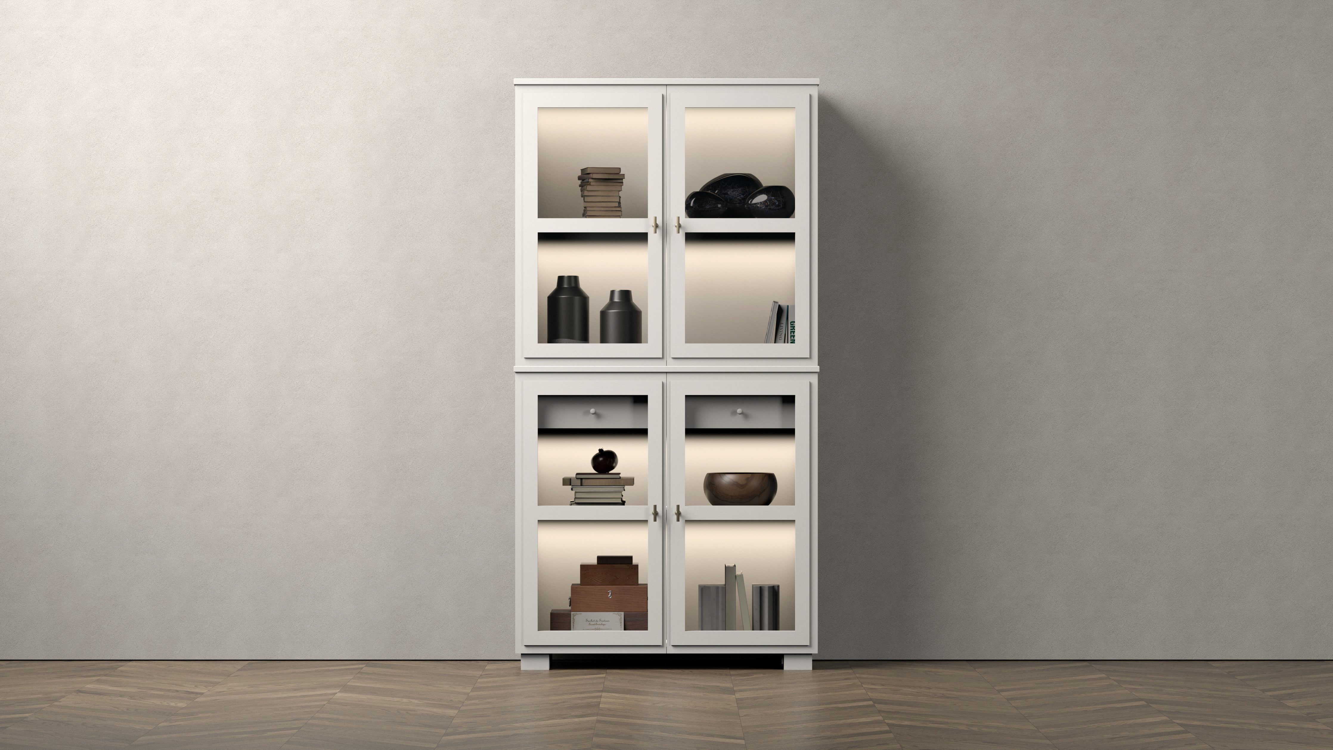Camden Display cabinets offer an elegant and functional solution for storing and displaying your favorite items. The stable base consists of a sideboard with glass doors, a shelf and a practical drawer, which provides plenty of storage space. Above is a section with glass doors and a shelf, which creates a uniform and stylish design. The built-in lighting highlights the content and creates a warm atmosphere. The furniture is available in the colors White and Black, perfect for giving your home a modern feel.