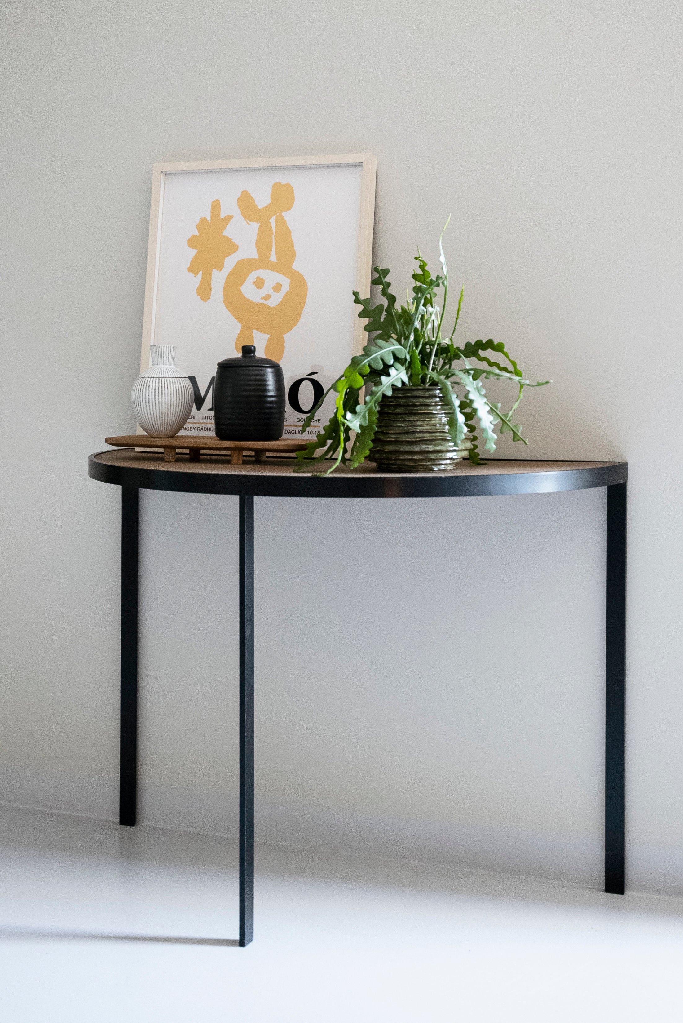 Squares console table is a half-moon-shaped table that is ideally placed against a wall and adorned with a beautiful lamp or storage for your essentials when you're on the go. It comes with a leg frame in Black or Silver Grey metal and a top in Black Oak or Burned Walnut.